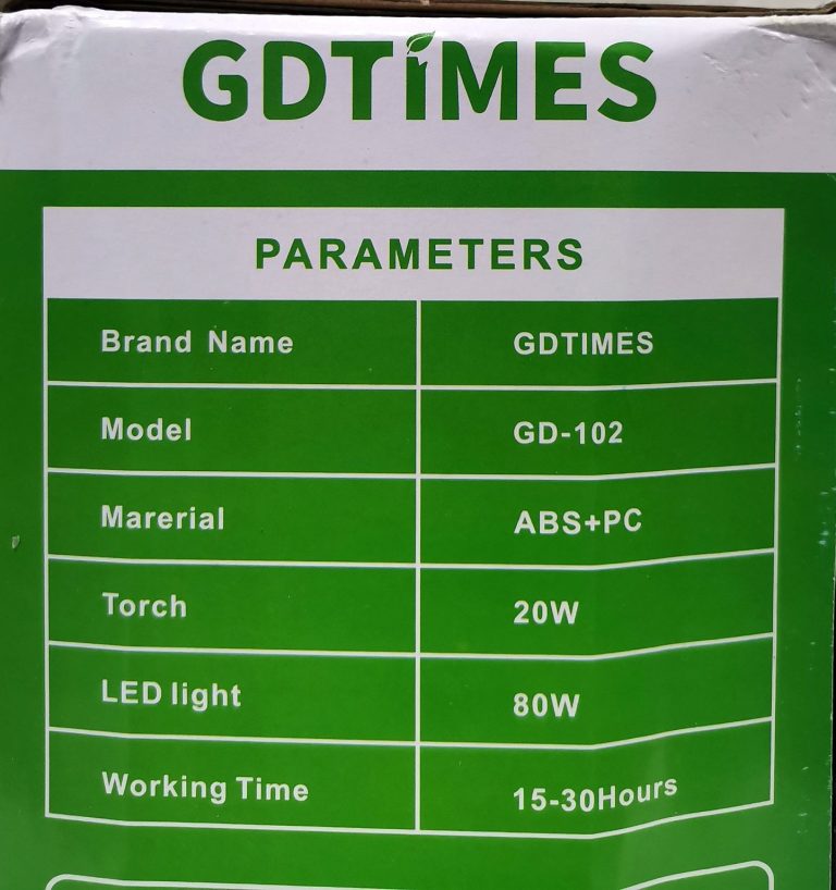 THIS PRODUCT HAS 2 SUPER BRIGT 80W LED LIGHTS AND COMES WITH 3 EXTRA DETACHABLE 20W BULBS. THE BATTERY IS A POWERFUL LONG LASTING LITHIUM BATTERY, THAT GIVES OVER 15 HOURS OF BRIGHT LIGHT. ORDER NOW AND GET A FREE MINI FAN.