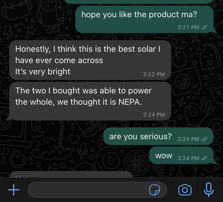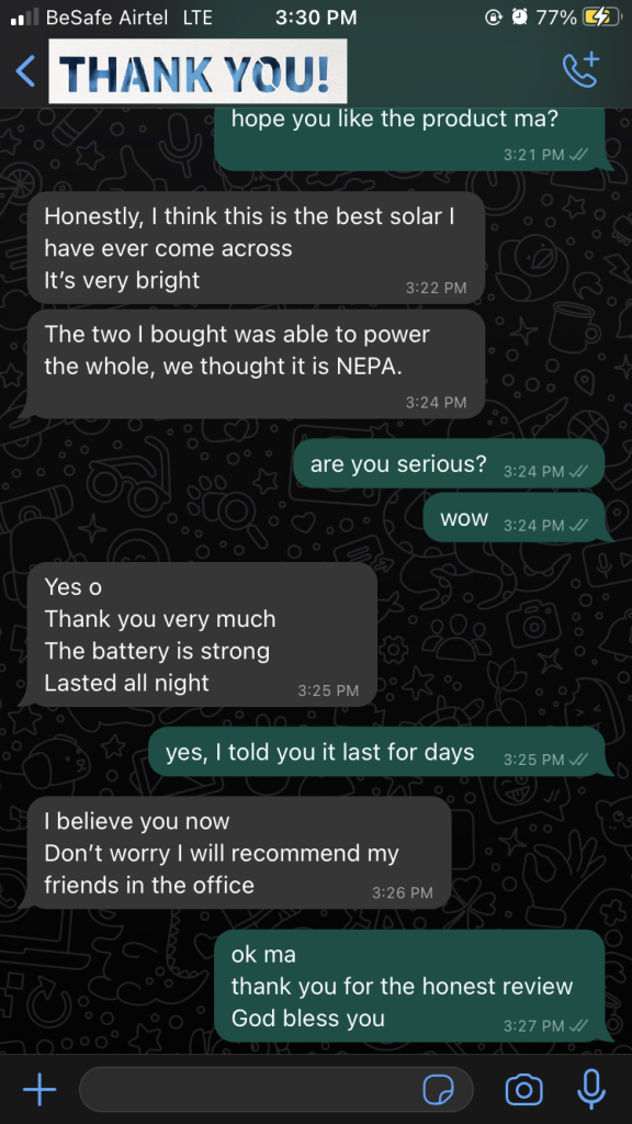 Say bye-bye to darkness, noisy generators, and high fuel costs. This product, providing more than 10hrs of bright light, is your best friend for the night when nepa fails, as it often does. Light up your nights with confidence and peace.